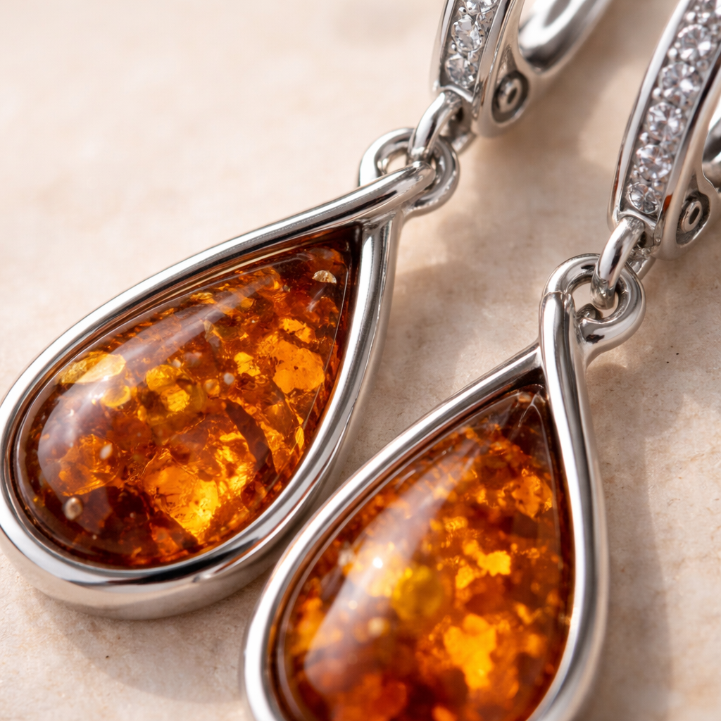 When paired with sterling silver 925, amber earrings get an even cleaner, more polished look. Silver settings can highlight lighter amber tones beautifully, while darker amber creates a warm contrast that feels classic and versatile.