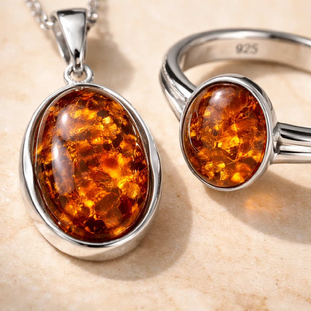 Amber looks beautiful in several settings, but sterling silver 925 is especially popular because it gives a clean, polished contrast to the warmth of the stone.