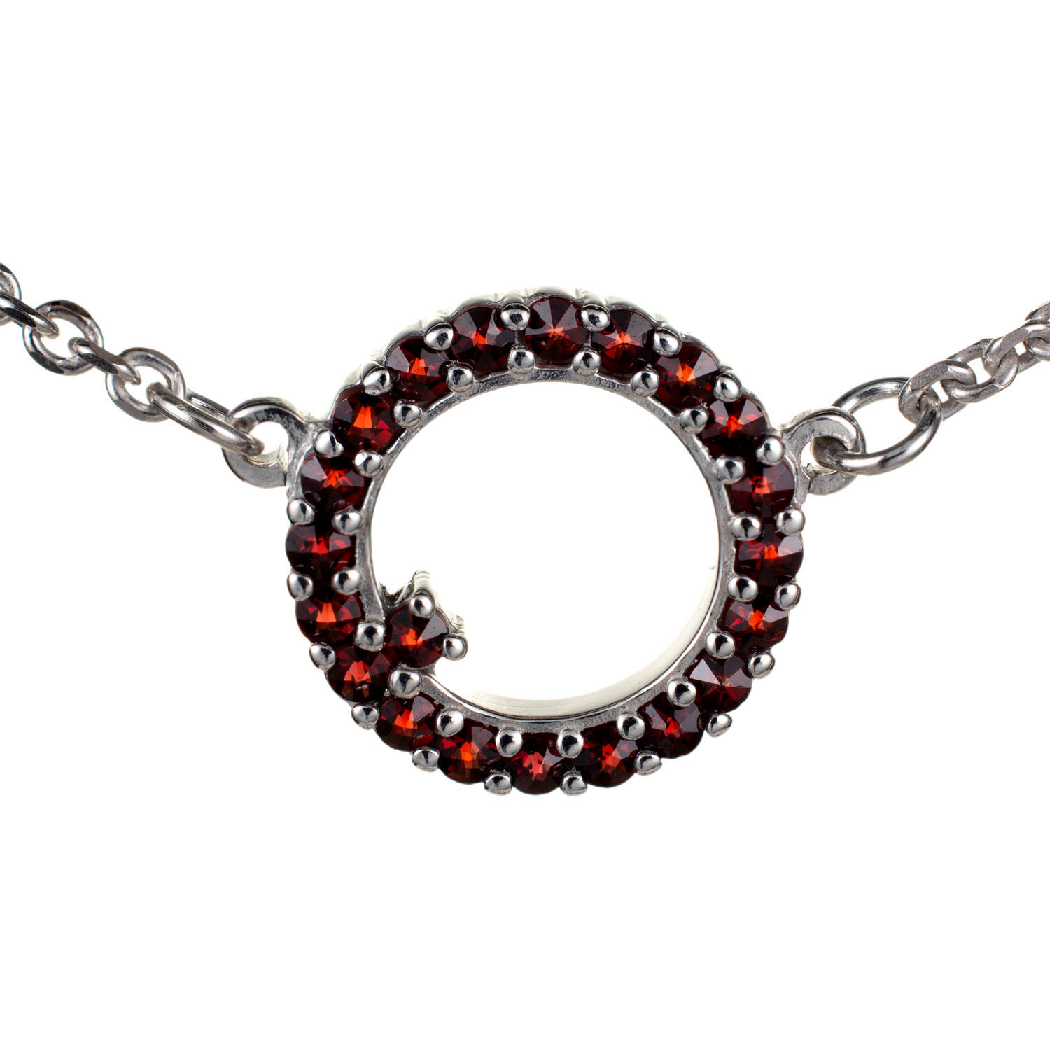 A bright note of scarlet that brings out the best in your favorite outfits, thisĀ bohemian garnet circle necklace shines with a brilliance all it’s own. It features 21 beautiful burgundy garnets set into a shimmering rhodium-plated sterling silver ā€œO,ā€ accented with a single garnet mounted on the inside for visual interest. This unique garnet necklace design suspends the pendant in place between both sides of the chain, rather than using a bail: this keeps your new garnet jewelry centered at the neck, ready to be admired.