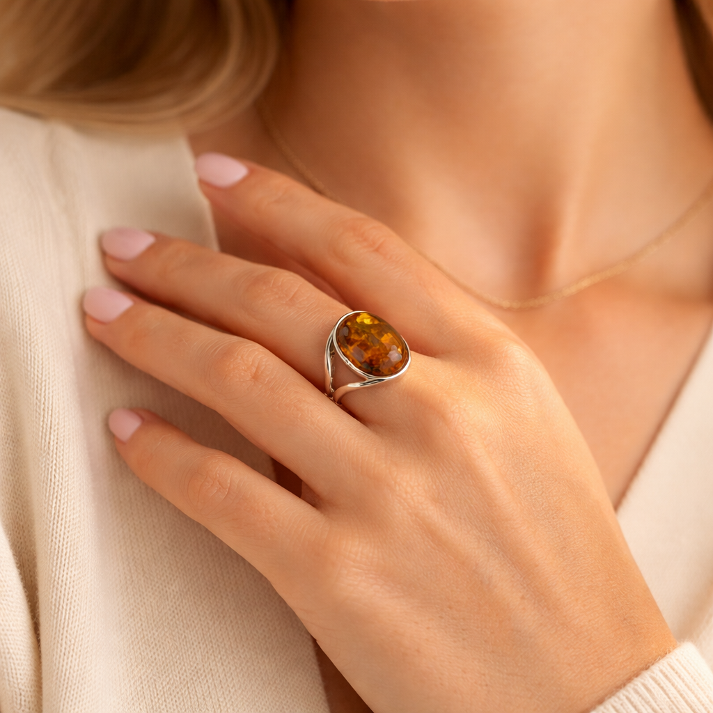 A sterling silver amber ring can do more than people expect. It can look easy and relaxed with jeans and a sweater, or polished enough for dinner, events, and gifting, without needing a full jewelry plan. The trick is not to overthink it: choose the right tone, keep the rest balanced, and let the ring do its job.