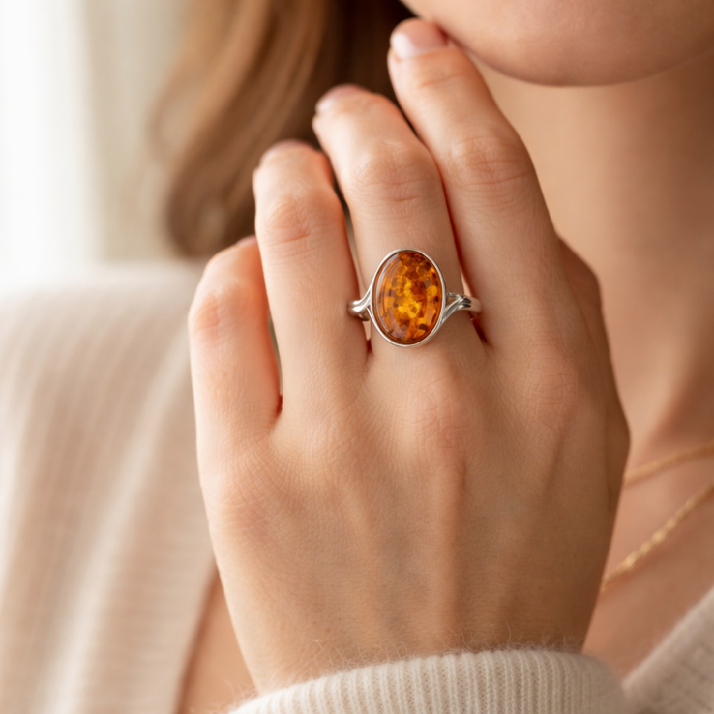 If you’re buying your first amber ring, a medium-size oval in sterling silver 925 is often the easiest place to start because it works with both casual outfits and dressier looks.