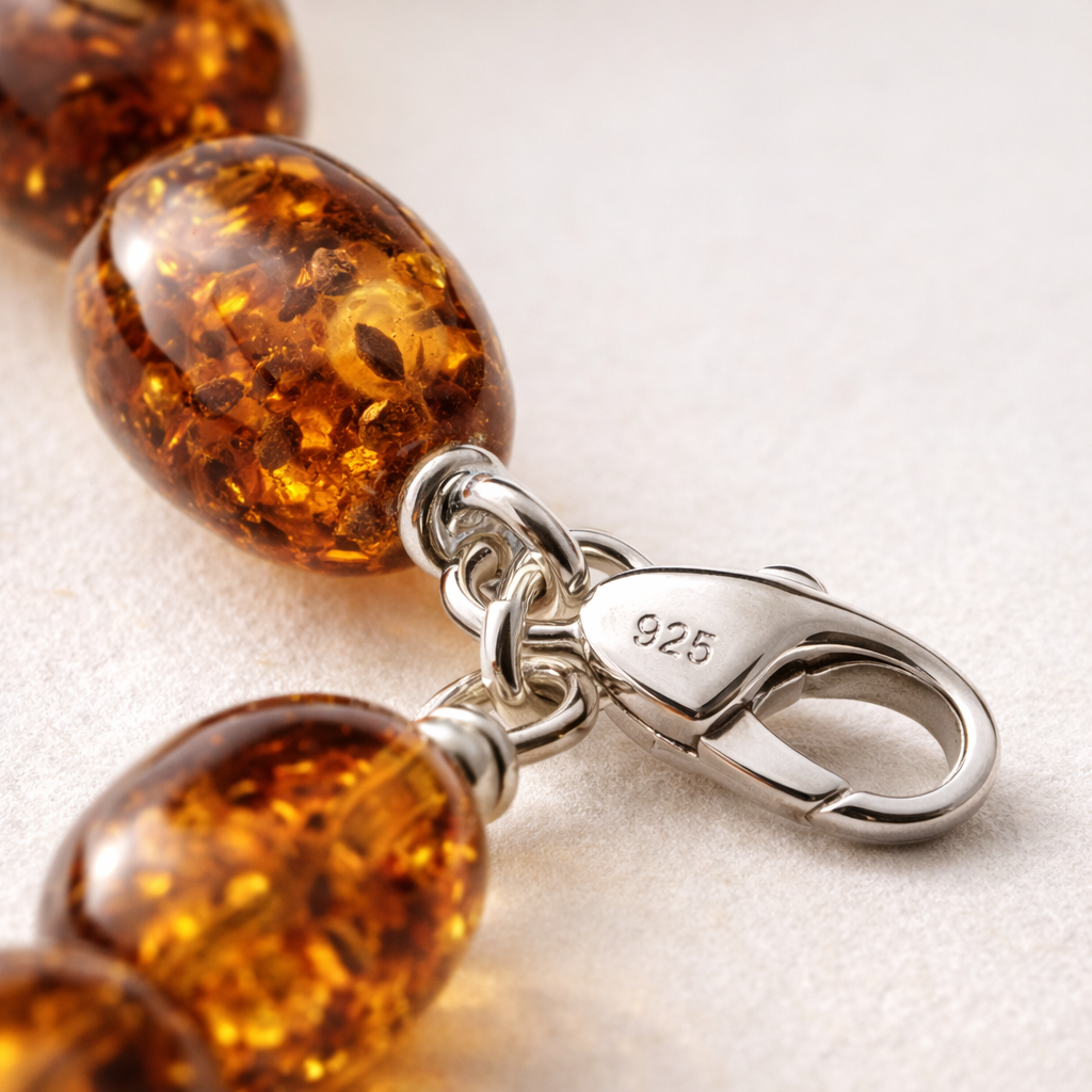 For a cleaner, more elevated look, pair Baltic amber with sterling silver 925 pieces. The cool shine of silver balances the warmth of amber and makes the overall style feel more tailored.