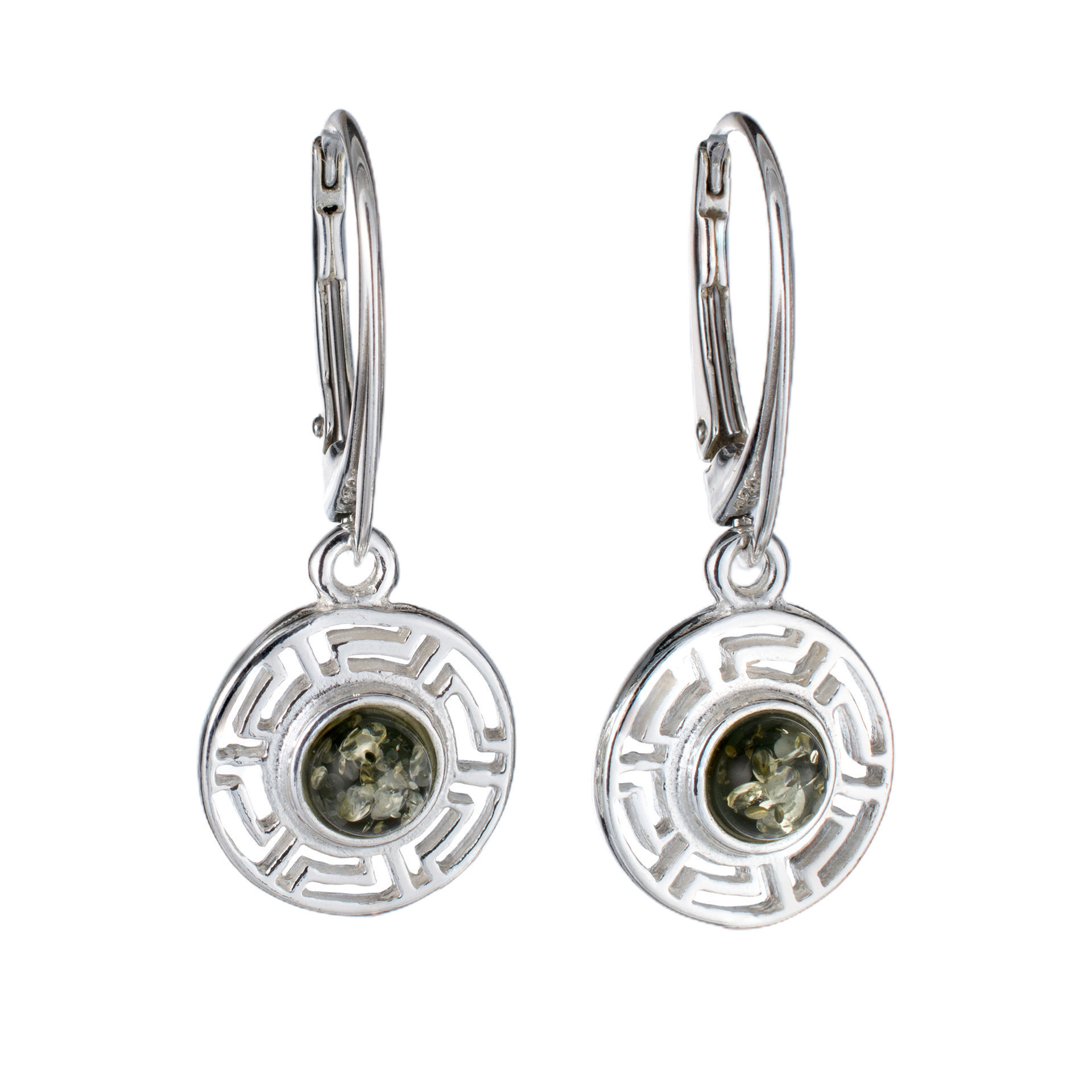 These light  Baltic green amber earrings are perfect for adding a splash of color to any outfit. They are handmade with genuine Baltic amber and 925 Sterling Silver. The sterling silver settings are adorned with a delicate Greek key pattern, and the round amber stones are a gorgeous forest green color.