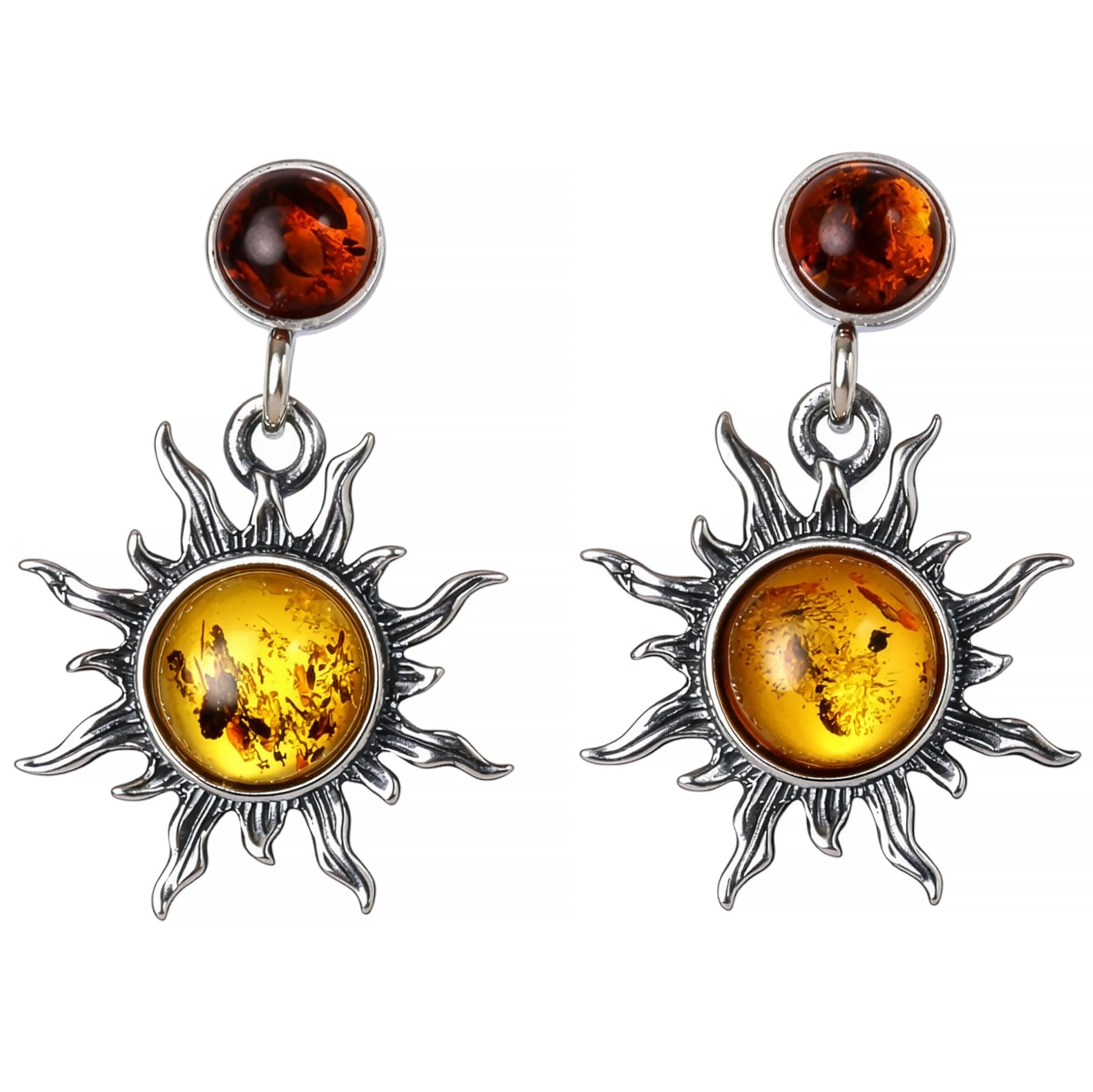Genuine Baltic Honey Amber Sun Earrings in 925 Sterling Silver - Two-Tone Amber Stud Dangles Post Back