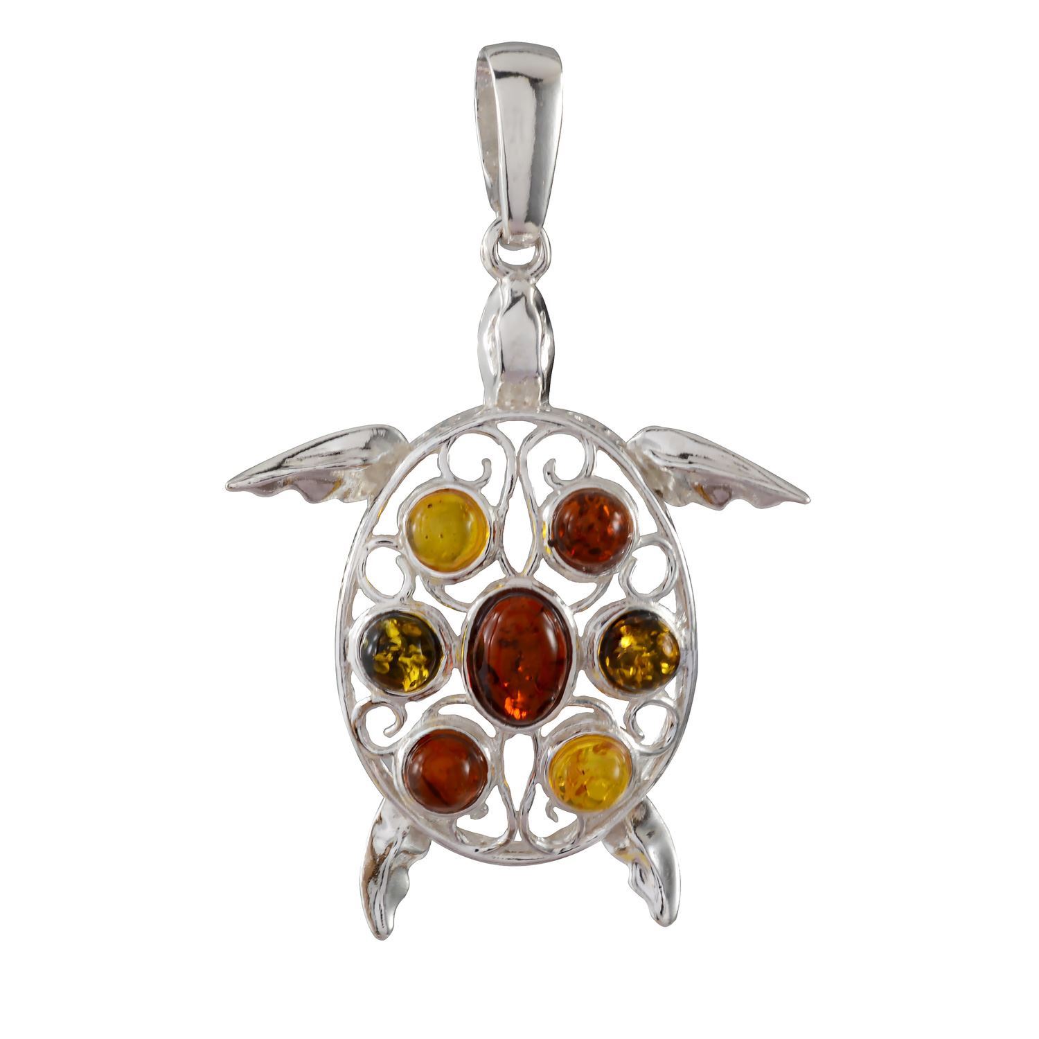 As a symbol of longevity, fertility, endurance, persistence, and femininity, the turtle reminds us all of the incredible odds it takes to thrive. A gentle and kind creature, wearing it in jewelry designs brings the best of energies along with it.Holiday Gift Shops is proud to present this stunning, hand-crafted Sterling Silver and Multicolored Baltic Amber Turtle Pendant to win your affections. Made in Europe, it uses genuine 925 sterling silver and Baltic amber stones for a unique design. Each turtle pendant is truly one of a kind as Baltic amber varies in appearance from stone to stone. Some are lighter while others are darker, giving them each a special look.