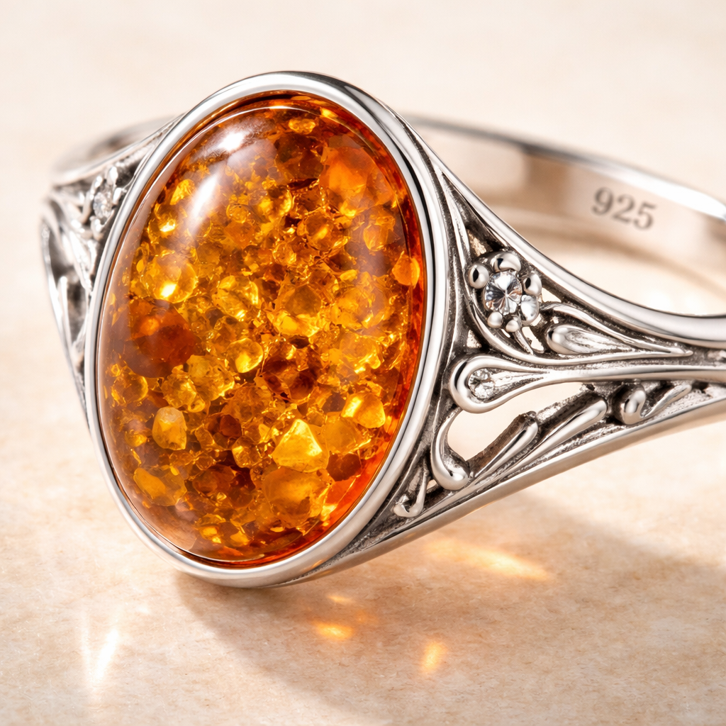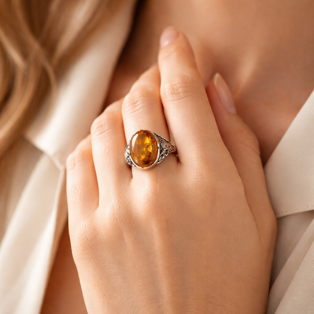 A premium amber ring also needs the right metal. Sterling silver 925 is a popular choice because it gives the ring brightness, durability, and a clean finish that pairs beautifully with warm amber tones.